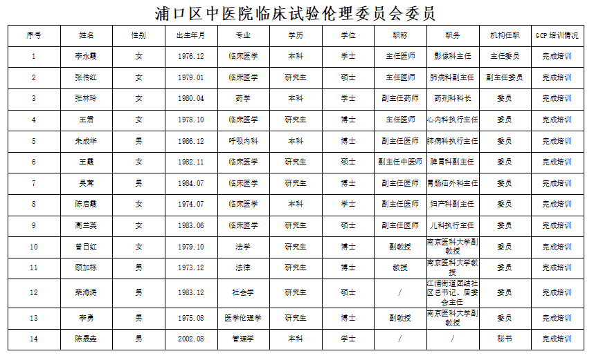 南京市浦口区中医院临床试验伦理委员会成立于2025年3月28日,现已通过国家全民健康保障信息平台备案系统完成备案。本院临床试验伦理委员会由从事医药相关专业人员、伦理学专家、法律专家以及社区代表组成,符合国家药品监督管理局《药物临床试验质量管理规范》《药物临床试验伦理审查工作指导原则》和国家卫生健康委员会《涉及人的生命科学和医学研究伦理审查办法》中关于伦理委员会委员组成的要求。本委员会共有委员13名,其中设主任委员1名,副主任委员1名,另设专职秘书1名,委员及秘书均经过GCP及伦理相关知识的培训。